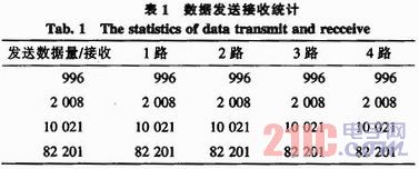 我們?cè)跍y(cè)試中利用串口助手,波特率設(shè)為115 200,測(cè)試結(jié)果如圖3所示,實(shí)踐證明,使用FT4232H芯片設(shè)計(jì)出來(lái)的USB轉(zhuǎn)換器可使在串口RS422和USB口之間非常容易地建立可靠的連接。能夠同時(shí)接收來(lái)自四路RS422接口的數(shù)據(jù),而且此四路RS422接口任何一路或者多路停止傳送數(shù)據(jù),對(duì)其他路數(shù)的數(shù)據(jù)傳送沒(méi)有任何的影響。說(shuō)明四路RS422接口相互之間是獨(dú)立工作的。同時(shí)我們也做了數(shù)據(jù)的掉包統(tǒng)計(jì),如表1所示。從表1結(jié)果表明,在發(fā)送數(shù)據(jù)的過(guò)程中,并沒(méi)有出現(xiàn)掉包的情況,因此達(dá)到了設(shè)計(jì)要求。