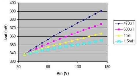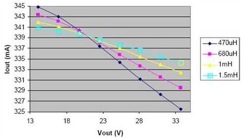 上圖是不同電感值下的頻率響應(yīng)。下圖說明了電感減小時(shí),在輸入電壓的變化范圍內(nèi),負(fù)載電流的變化明顯增大。