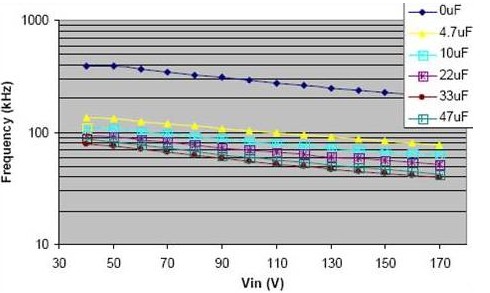 下圖給出了頻率根據(jù)不同的輸出電壓和不同的電感值的變化曲線。
