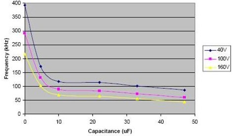 首先,我們來看一下電感的影響,假設(shè)沒有輸出電容(COUT)的存在,這樣負(fù)載電流和電感電流完全一致,能更清楚地說明電感的影響。下圖給出了在輸入電壓的變化范圍內(nèi),電感值對(duì)頻率的影響。可以看出,輸入電壓對(duì)頻率的影響很大,電感值在輸入低電壓時(shí)對(duì)降低頻率有很大影響。(注:不一定是和參考圖完全一樣,在此只是說明問題)