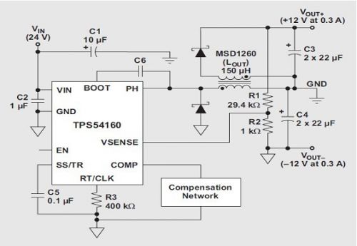 匹配正負(fù)電源軌是許多工業(yè)應(yīng)用的常見(jiàn)要求,對(duì)放大器而言更是如此。我們可以對(duì)寬輸入范圍降壓轉(zhuǎn)換器進(jìn)行配置,以提供負(fù)輸出電壓。使用一個(gè)耦合電感代替這種反相降壓轉(zhuǎn)換器的電感,并增加一個(gè)二極管和電容器,便可將這種反相降壓轉(zhuǎn)換器變?yōu)橐粋€(gè)雙輸出的轉(zhuǎn)換器。圖 3 顯示了以這種方法使用的 TI TPS54160 和 Coilcraft 150-μH MSD1260。只要每個(gè)軌的負(fù)載稍有接近,我們就對(duì)每個(gè)軌之間的差異進(jìn)行調(diào)節(jié)而非單獨(dú)調(diào)節(jié)每個(gè)軌,但耦合電感卻可以幫助提供對(duì)每個(gè)軌進(jìn)行調(diào)節(jié)。