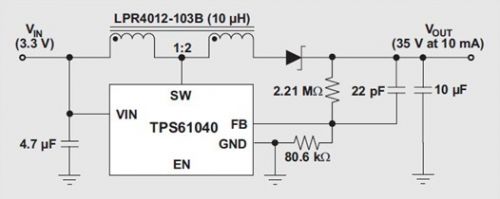 集成 FET 的 DC/DC 轉(zhuǎn)換器的輸出電壓受限于轉(zhuǎn)換器的開(kāi)關(guān)電流額定值。將一個(gè) 1:1 以上匝比的耦合電感連接至轉(zhuǎn)換器的開(kāi)關(guān) (SW) 引腳,可以擴(kuò)展所有升壓轉(zhuǎn)換器的有效輸出電壓范圍。例如,圖 4 顯示了 30-V 絕對(duì)最大電流額定值的 TI TPS61040 升壓轉(zhuǎn)換器,其作用是提供 35V 或更高的電壓,同時(shí)還顯示了一個(gè) 1:2 耦合電感 Coilcraft LPR4012-103B。耦合電感結(jié)構(gòu)多繞組端與二極管串聯(lián)時(shí),單繞線電感——以及由此產(chǎn)生的轉(zhuǎn)換器開(kāi)關(guān) FET—電壓只有輸出電壓的三分之一,即負(fù)輸入電壓。
