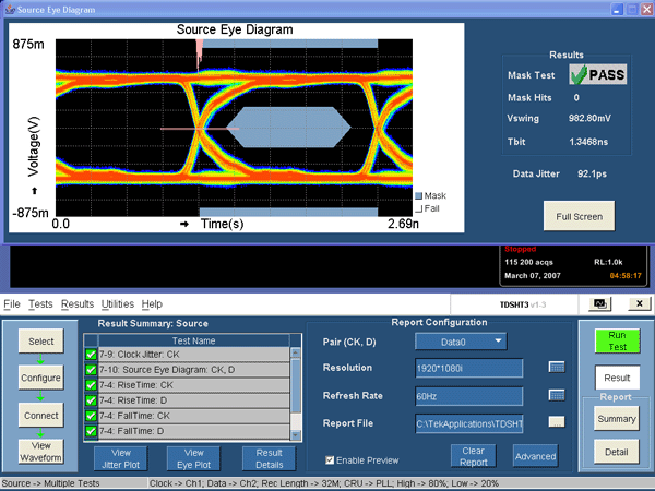 圖2是一次利用HDMI一致性測試軟件進行HDMI V1.3源端測試得到的結(jié)果。同時,為保證全面體現(xiàn)信號特點,CTS 1.3b還規(guī)定了捕捉信號所需的最小示波器記錄長度。根據(jù)該規(guī)定,示波器至少應(yīng)能累積40萬個單位時間間隔(或Tbit)來繪制眼圖。在16 M/20 M的記錄長度下,示波器至少能捕捉40萬單位時間間隔的低分辨率信號,或260萬單位時間間隔的高分辨率信號??紤]到高達3.4Gbps的數(shù)據(jù)率,高采樣率(高于10GS/s)下示波器的最小記錄長度就應(yīng)大于16M。