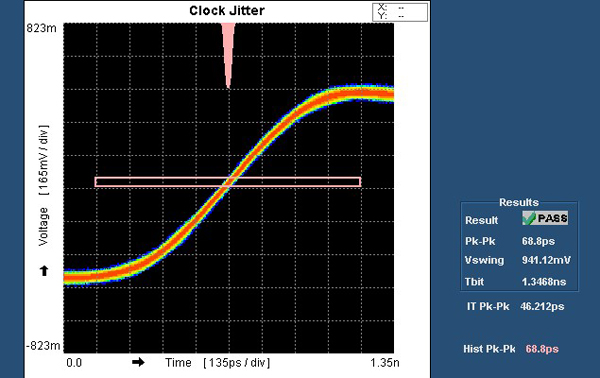 任何傳輸系統(tǒng)最關(guān)心的問題都是時鐘抖動,抖動測試的目的就是檢查并確保時鐘信號中沒有過多的抖動。例如,占空比抖動測量就是評估時鐘確定性抖動的一種很好的方法。CTS規(guī)定,在50%的標(biāo)稱占空比附近可以有+10%的變化裕量。但應(yīng)注意,此處所說的占空比變化是指在大量捕獲信號的基礎(chǔ)上進行測量得到的結(jié)果。因為CTS規(guī)定,測量占空比變化至少需要一萬個觸發(fā)波形。這樣一來,示波器的觸發(fā)再準(zhǔn)備速率(Trigger re-arm rate)就變成最重要的一個因素。一般情況下,觸發(fā)再準(zhǔn)備速率約為每秒100個波形(wfms/s)。