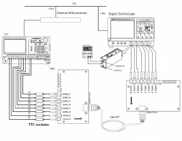 該例中,數(shù)字熒光示波器通過一條GPIB電纜與TMDS信號發(fā)生器DTG5334相連,需要時還可通過一條GPIBUSB-B電纜將其與抖動插入信號發(fā)生器AWG/AFG相連。HDMI設(shè)計與測試工程師可以在一套閉環(huán)裝置中控制這些信號發(fā)生器,利用示波器上自帶的“一鍵運行”一致性測試軟件自動實現(xiàn)復(fù)雜的電纜和接收器測試。該例中采用的閉環(huán)裝置大大縮短了測試時間,也消除了測試裝置的非線性。