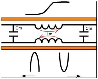 互阻抗沿著兩條走線呈均勻分布。串?dāng)_在數(shù)字門(mén)電路向串?dāng)_線打出上升沿時(shí)產(chǎn)生,并沿著走線進(jìn)行傳播: