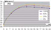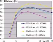 - 在600kHz,12.5A條件下, 漏極電感的50%比0%的效率將減少8.5%。由于MOSFET溫度過高,12.5A以上便無法進(jìn)行試驗(yàn)。