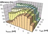 該結(jié)果的解釋需要進(jìn)一步研究。現(xiàn)在我們可以說明,在電路板合理的電感值范圍內(nèi),漏極和源極電感必須減小,以確保高的轉(zhuǎn)換器效率。該仿真得出如下結(jié)果: