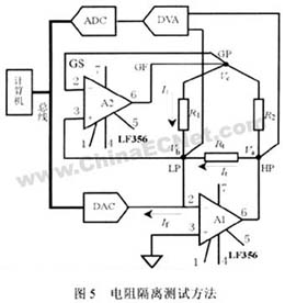 A2構(gòu)成電壓跟隨電路使Vc =Vb,從而I1=0。因此計算機通過16位電流輸出型DAC設(shè)定If 就控制了流過被測電阻Rt的電流I t,再通過由DVA和ADC構(gòu)成的電壓檢測電路測試出 Rt兩端的電壓就可算出Rt 的阻值。