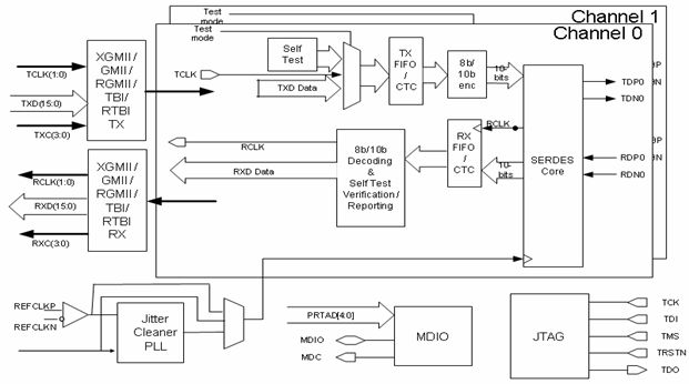 下面詳細(xì)介紹了6個(gè)功能模塊及其應(yīng)用特點(diǎn):并行接口、串行接口、時(shí)鐘分布電路、8B/10B編解碼電路、PRBS測(cè)試以及相關(guān)寄存器訪問(wèn)控制接口MDIO。