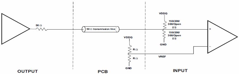 并行接口采用單端的HSTL Class1電平接口,遵循EIA/JESD8-6標(biāo)準(zhǔn)電氣指標(biāo)規(guī)格,同時(shí)支持1.5V或1.8V的電源電壓。為了提高HSTL高速接口的SI性能,TLK3132并行接收側(cè)集成了可寄存器配置的匹配電阻,采用戴維南等效電路匹配方式,等效于加一個(gè)匹配電阻到VDDQ/2,同時(shí)也可關(guān)閉內(nèi)部的阻抗匹配電路,如圖2所示;并行發(fā)送側(cè)可通過(guò)寄存器配置4種不同的邊沿速率。