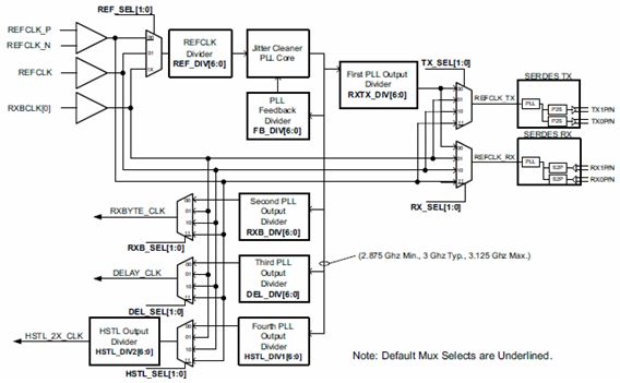 SERDES實(shí)現(xiàn)的一個(gè)關(guān)鍵技術(shù)是時(shí)鐘的產(chǎn)生和分布,圖5是TLK3132芯片內(nèi)部的時(shí)鐘架構(gòu)。時(shí)鐘配置非常靈活,支持單端或差分參考時(shí)鐘輸入,同時(shí)包括多個(gè)高頻鎖相環(huán)電路: