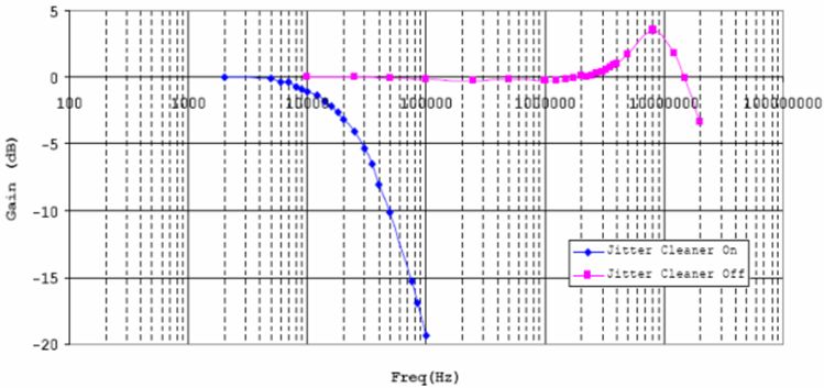 2)由于串并模塊里的高頻倍頻器環(huán)路帶寬很大,最大可達(dá)30MHz左右。故TLK3132內(nèi)部集成了一顆基于LC振蕩器的抖動(dòng)濾除鎖相環(huán),環(huán)路帶寬通常設(shè)置在幾百KHz以內(nèi),可以對(duì)輸入?yún)⒖紩r(shí)鐘進(jìn)行濾除,降低參考時(shí)鐘對(duì)幾百KHz 以上抖動(dòng)性能的要求,圖6是TLK3132發(fā)送鏈路在抖動(dòng)濾除器打開和關(guān)閉下的環(huán)路傳遞函數(shù)。此外,抖動(dòng)濾除器也可對(duì)鏈路恢復(fù)的時(shí)鐘(只可接收CH0通道的恢復(fù)時(shí)鐘RXBCLK(0))進(jìn)行抖動(dòng)濾除,提高恢復(fù)時(shí)鐘的信號(hào)質(zhì)量。