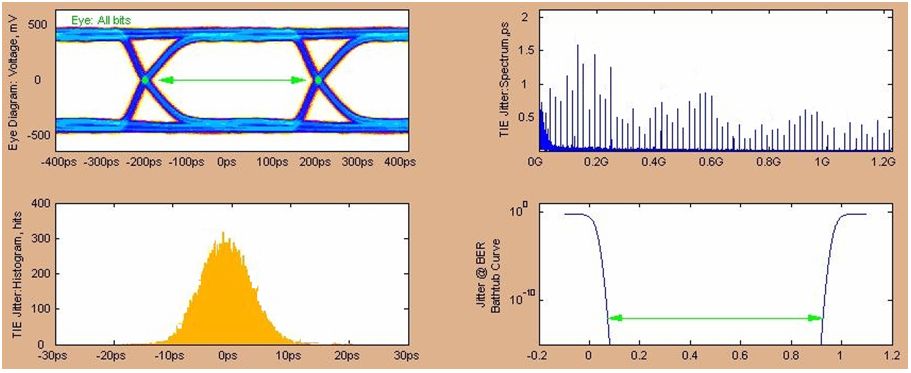 圖10 1228.8Mbps發(fā)送側(cè)眼圖(經(jīng)5inches FR4走線,調(diào)整了最優(yōu)的去加重補(bǔ)償)