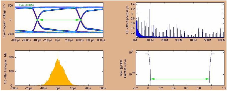 圖11 2457.6Mbps發(fā)送側(cè)眼圖(經(jīng)5inches FR4走線,調(diào)整了最優(yōu)去加重補(bǔ)償)