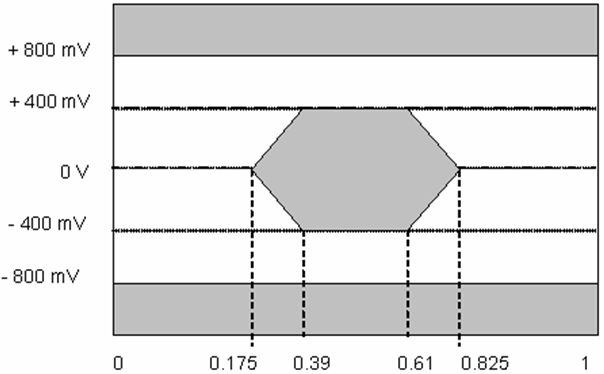 在高速數(shù)據(jù)鏈路通信中,抖動(dòng)指標(biāo)是非常關(guān)鍵的,CPRI接口相應(yīng)推薦了高速串行信號(hào)的眼圖和抖動(dòng)規(guī)格。在SERDES發(fā)送側(cè),CPRI要求的眼圖模板如圖8所示。