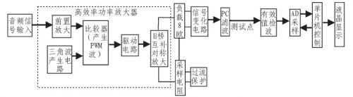 如圖1所示為系統(tǒng)的整體實現(xiàn)框圖,系統(tǒng)由高效率功率放大、信號變換電路、過流保護及功率測量4個主要模塊組成。其中最核心的高效率功率放大器又由前置放大、三角波產(chǎn)生電路、比較器電路、驅(qū)動電路、H橋互補對稱放大5部分構(gòu)成。輸入音頻信號經(jīng)過前置放大電路進行放大調(diào)理后,分上下部與兩路三角波信號進行比較,得到兩路相互對應(yīng)的PWM波;即對音頻信號進行脈寬調(diào)制,而后經(jīng)驅(qū)動電路增加其信號的驅(qū)動能力,再給入H橋模塊,利用占空比的變化控制功率開關(guān)管的導(dǎo)通與截止,實現(xiàn)功率放大,之后再對負載上的輸出進行低通濾波濾出原音頻信號。在負載上將信號給入信號變化電路,將雙端信號轉(zhuǎn)化為單端信號,經(jīng)一截止頻率為20 kHz的RC濾波器后接測試儀表測試。同時在此處將單端信號真有效值檢波,經(jīng)AD采樣后送入單片機內(nèi)進行功率計算及顯示。系統(tǒng)還有過流保護功能,0.1Ω采樣電阻與負載串聯(lián),采出流過負載的電流值,經(jīng)放大比較后,用繼電器控制功率放大部分的供電,從而實現(xiàn)保護作用。系統(tǒng)最大不失真輸出功率大于等于1 W,可實現(xiàn)電壓放大倍數(shù)1~20連續(xù)可調(diào),因采用D類放大方案,可達到較高的效率,輸出噪聲很小,功率顯示誤差很小。