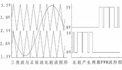 雙路比較器電路采用低功耗、可單電源工作的雙路比較器芯片LM393構(gòu)成。此處為提高系統(tǒng)效率,減少后級H橋中CMOS管不必要的開合,用兩路偏置不同的三角波分別與音頻信號的上半部和下半部進行比較,產(chǎn)生兩路相互對應(yīng)的PWM波信號給后級驅(qū)動電路進行處理,雙路比較波形圖如圖3所示。此處值得注意的是將上半部比較處理為音頻信號接比較器的負向端、三角波信號接正向端;下半部比較則相反,這樣形成相互對應(yīng),在音頻信號的半部形成相應(yīng)PWM波時,另半部為低電平,可保征后級H橋中的CMOS管沒有不必要的開合,以減少系統(tǒng)功率損耗。利用電位器將上半部比較三角波偏置調(diào)至3 V,下半部比較三角波偏置調(diào)至2 V.還需注意,三角波信號應(yīng)比需比較范圍內(nèi)的音頻信號幅度稍大一些,且偏置調(diào)節(jié)要較準確,以防音頻信號某些點比較不到,后續(xù)濾波還原原信號時產(chǎn)生失真。