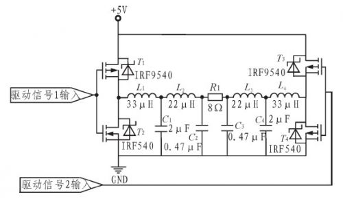 H橋互補對稱電路如圖4.采用低導(dǎo)通電阻、開關(guān)速率快、受溫度影響小的場效應(yīng)對管IRF9540和IRF540組成互補推挽放大電路。運用對稱輸出方式,充分利用電源電壓,浮動輸出載波峰峰值量大可達10 V,有效地提高了輸出功率。
