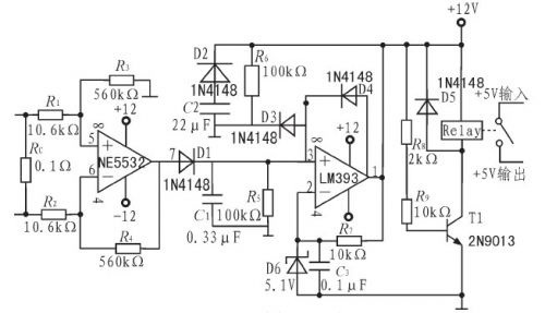 經(jīng)過放大后的信號經(jīng)過由D1、C1、R5組成的峰值檢波部分,檢出信號幅度值送至比較器與設(shè)定的基準電壓進行比較。比較器選用低功耗、響應(yīng)速度較快的雙路比較芯片LM393.比較器負端用穩(wěn)壓管D6及C3、R7設(shè)置為5.1V,比較器接成遲滯比較方式,一旦過流,即可自鎖。此時比較器輸出的高電平使三極管T1導(dǎo)通,繼電器的地控制端與地聯(lián)通,繼電器吸合,切斷功放部分的供電,達到保護目的。因比較器自鎖,所以在解決過流問題后,關(guān)斷保護模塊的電源,才能重新進入保護狀態(tài)。D2、D3、R6、C2組成開機延時電路,在斷電后,C2通過D2快速放電,防止開始瞬間C2上的殘余電壓對3號腳影響,防止比較器在非正常狀態(tài)下進入自鎖狀態(tài),使保護模塊不能發(fā)揮正常作用。