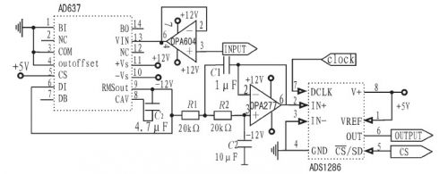 輸入綴用OPA604構(gòu)成一射極跟隨器已達到隔離前后級的作用。改變平均電容的值可設(shè)定平均時間常數(shù),并決定低頻準確度、輸出波紋的大小和穩(wěn)定時間。交流波紋分量可以用增大此電容的值來減少,但這樣會使建立時間增大,所以選擇用后接一個二階有源低通濾波器的方法來減少輸出的紋波。得出真有效值后直接給入ADS1286進行模數(shù)轉(zhuǎn)換,再由FPGA處理,計算出系統(tǒng)的輸出功率并進行顯示。