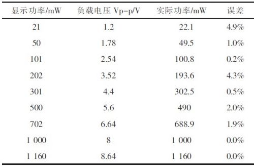 1)功率顯示誤差測量用Agilent信號源給出輸入音頻信號,示波器在單端輸出測試點測負載上電壓峰值Vo,據(jù)式計算出實際功率,進而計算出顯示誤差,結(jié)果見表1所示。