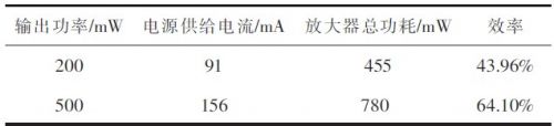 3)效率測量 用直流電源對功放電路單獨供電,以便測試效率。供電電壓+5 V.用與測通頻帶相同的方法給出給出輸入信號,用示波器觀察輸出信號幅值,調(diào)整輸出為200 mW及500 mW,將四位半數(shù)字多用表串入放大器電路中,測出電路電流I.根據(jù)式計算出功率放大器效率,結(jié)果見表2所示。