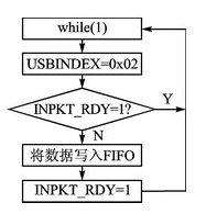 下面以IN端點(diǎn)2為例,說(shuō)明數(shù)據(jù)如何通過(guò)USB接口傳遞到電腦上。當(dāng)電腦發(fā)出IN請(qǐng)求時(shí),如果USB端點(diǎn)2的FIFO非空,就向電腦發(fā)送FIFO里的內(nèi)容;如果FIFO為空,則向電腦發(fā)送一個(gè)空包作為回應(yīng)。CC2531通過(guò)寄存器位USBCSIL.INPKT_RDY來(lái)控制電腦和8051 MCU內(nèi)核對(duì)USB的FIFO的使用權(quán)。當(dāng)INPKT_RDY=1時(shí),電腦正在對(duì)USB端口進(jìn)行訪問(wèn),8051 MCU內(nèi)核無(wú)法向FIFO內(nèi)寫入數(shù)據(jù);當(dāng)INPKT_RDY=0時(shí),8051 MCU內(nèi)核可以將發(fā)送數(shù)據(jù)寫入FIFO內(nèi),置位INPKT_RDY=1,完成數(shù)據(jù)的上傳。其流程如圖4所示。