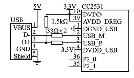 CC2531的USB硬件連接很簡(jiǎn)單,如圖3所示。采用USB總線供電方式,通過(guò)電壓轉(zhuǎn)換芯片AM11173.3為硬件電路提供3.3 V電壓(圖中未畫出)。由于該設(shè)備為全速設(shè)備,因此D+信號(hào)線通過(guò)電阻上拉。