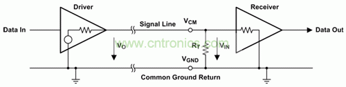 單端數(shù)據(jù)傳輸僅使用一條信號(hào)線,其電勢被看作接地。當(dāng)信號(hào)線為信號(hào)電流提供正向通道時(shí),接地線會(huì)提供回流通道。圖 1 顯示了單端傳輸通道的基本示意圖。