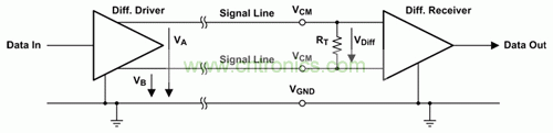 差動(dòng)信號(hào)傳輸采用由兩條導(dǎo)線組成的信號(hào)線對(duì):一條用于使電流正向流動(dòng),另一條用于使電流回流。每條信號(hào)導(dǎo)線都具有一個(gè)共模電壓 VCM,該電壓與 50% 的差動(dòng)驅(qū)動(dòng)器輸出電壓 VOD 相疊加,但彼此極性相反(請(qǐng)參見圖 2)。