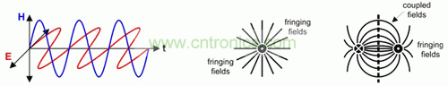 圖 3 從單導(dǎo)線周圍的大散射磁場和差動(dòng)信號(hào)線對(duì)緊耦合導(dǎo)線回路之外的小散射磁場輻射出的 TEM 波