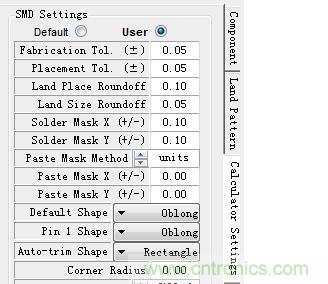 4、點(diǎn)擊Calculator Settings(豎排字),選User將Solder Mask X及Y改為0.1(一般阻焊層比焊盤大0.1mm)