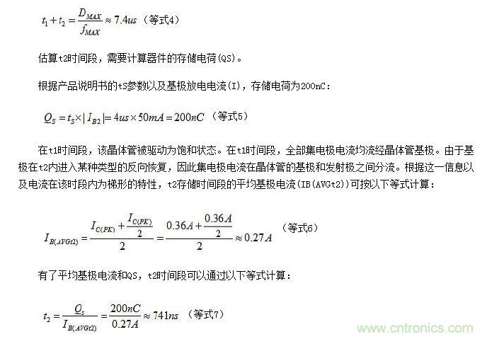 估算晶體管損耗,需要估算圖4中所示的各個(gè)時(shí)間段。t1時(shí)間段是最大占空比的時(shí)長(zhǎng),對(duì)于本設(shè)計(jì)示例而言大約是7.4us。