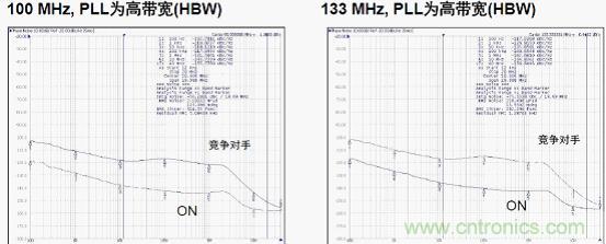 例如,NB3N1200K/NB3W1200L零延遲緩沖器(ZDB)帶12路HCSL/NMOS推挽輸出,特性包括:支持DIF SRC時鐘;12個差分時鐘輸出對@0.7V (NB3N1200K) ;12個低功耗NMOS推挽輸出對(NB3W1200L) ;針對100MHz和133 MHz優(yōu)化,符合PCIe 第2代/第3代和英特爾QPI相位抖動規(guī)范;符合低EMI擴(kuò)頻;最低輸入至輸出延遲變化的偽外部固定反饋;每12個輸出的單獨OE控制引腳。兩者的相位噪聲均優(yōu)于競爭對手,見圖5。