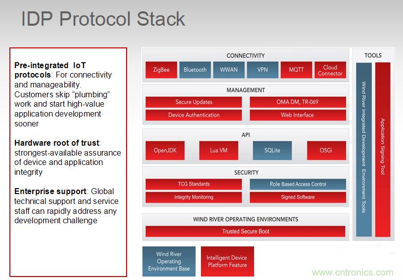 當(dāng)下物聯(lián)網(wǎng)面臨了三大挑戰(zhàn):連接、安全以及管理(數(shù)據(jù)的管理與分析),此外還存在新舊設(shè)備交替的過渡期,而Gateway是讓傳統(tǒng)設(shè)備實(shí)現(xiàn)聯(lián)網(wǎng)的最佳方式(如電表),蘇建豪如是說。風(fēng)河在Gateway中提供了IDP,是一個(gè)物聯(lián)網(wǎng)平臺,廠商可以在上面自己做開發(fā),而不需要再下功夫去考慮連接、安全等問題,有效節(jié)省開發(fā)時(shí)間。