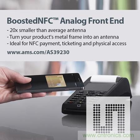 ams的新AS39230可提升天線信號(hào)質(zhì)量,從NFC標(biāo)簽、卡或卡仿真器向NFC讀寫器發(fā)送信號(hào),AS39230的信號(hào)強(qiáng)度是采用傳統(tǒng)無源負(fù)載調(diào)制(PLM,passive load modulation)方法的10倍。在空間受限的設(shè)計(jì)中,天線尺寸可縮至二十分之一,面積僅為100mm2或更小,同時(shí)可以保持信號(hào)強(qiáng)度不變。AS39230甚至準(zhǔn)許產(chǎn)品的金屬殼充當(dāng)天線,將NFC天線所需的電路板空間及相關(guān)成本降至零。