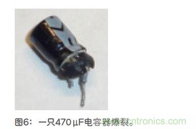 接著我用儀表檢測輸出電壓。在繼續(xù)閱讀下文之前,請回頭看一下圖2。你是否注意到最左邊那個(gè)緊鄰USB連接器的470μF電容器?我的手指擦過這個(gè)電容器,覺得很燙。然后我聽到呼的一聲,發(fā)現(xiàn)電容器爆裂開來,封裝的底端飛彈出去,見圖6。