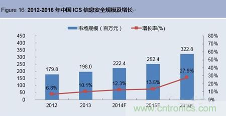 2014藍皮書還指出2013年中國信息安全市場總體規(guī)模為194億元,其中工業(yè)領域信息安全為23.28億元,占中國信息安全市場的12%。中國工業(yè)控制系統(ICS)信息安全市場整體規(guī)模為1.98億元,同比增長10.1%,相比2012年增速提高3.3個百分點。