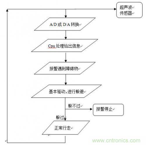 通過(guò)CMOS攝像頭采集路況信息,經(jīng)CPU處理判斷前方是否有障礙物。若無(wú),則車?yán)^續(xù)引導(dǎo)人前行;若有障礙物,則車發(fā)聲報(bào)警。通過(guò)超聲波