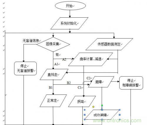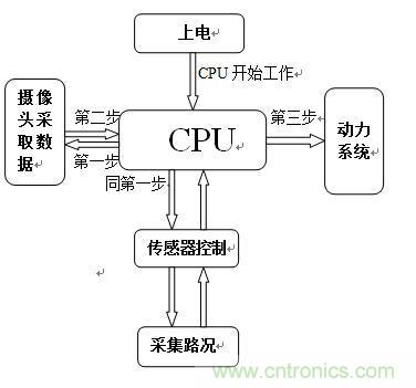說(shuō)明:上電之后,CPU開(kāi)始工作。首先,CPU開(kāi)始控制攝像頭和傳感器同時(shí)工作,同時(shí)采集信息,把采集回來(lái)的信息進(jìn)行分析,在CPU內(nèi)部進(jìn)行A/D或D/A轉(zhuǎn)換,然后將轉(zhuǎn)換后的信息傳遞給舵機(jī),使舵機(jī)在CPU的控制下進(jìn)行工作。
