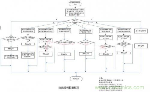 系統(tǒng)框圖如圖3所示,主控循環(huán)程序每隔一個(gè)采樣周期從FPGA接口中讀取各個(gè)傳感器的數(shù)值,并經(jīng)過(guò)處理后獲得小車的運(yùn)行狀態(tài),根據(jù)小車的當(dāng)前狀態(tài)采取相應(yīng)的控制算法計(jì)算出電機(jī)所需的控制電壓值,進(jìn)而,該控制電壓值經(jīng)過(guò)PMW處理后輸出到小車驅(qū)動(dòng)電機(jī),使小車按照希望的規(guī)律運(yùn)動(dòng)。為了使程序流程清晰簡(jiǎn)潔,框圖中以一個(gè)標(biāo)志信號(hào)來(lái)記錄小車所運(yùn)行的階段,控制器則根據(jù)小車所處的運(yùn)行階段進(jìn)行相應(yīng)的控制。