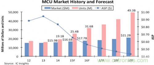 盡管將來的ASP還會繼續(xù)下滑,IC Insights預測明年的微控制器收會增長7%至177億美元,全球的出貨量會增長25%至316億顆。