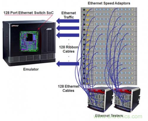 交換機(jī)和路由器已達(dá)到 256 個端口(到年底將會增加到 1024 個端口),而且它們可處理高達(dá) 120 Gb/s 的流量。同時,網(wǎng)絡(luò)交換的延遲也在持續(xù)下降中,最低延遲已降至 1 µs。所有這些因素促使如今的網(wǎng)絡(luò)交換機(jī)和路由器芯片成為有史以來最大規(guī)模的芯片,達(dá)到了五億門級。在流片完成之前驗證此類復(fù)雜 IC 設(shè)計是一項難以完成的任務(wù)。我們來考慮下具有 128 端口以太網(wǎng)接口的 SoC 設(shè)計。