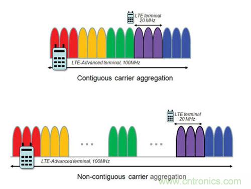 運營商目前處于載波聚合(CA)技術部署初期,這是LTE Advanced標準(3GPP Release 10)的一個特性。借助CA,運營商可以提高數據容量和吞吐量,其方式是把最多五個分量載波(每個載波在 1.4-20MHz之間)組合成最高達100MHz的總帶寬。