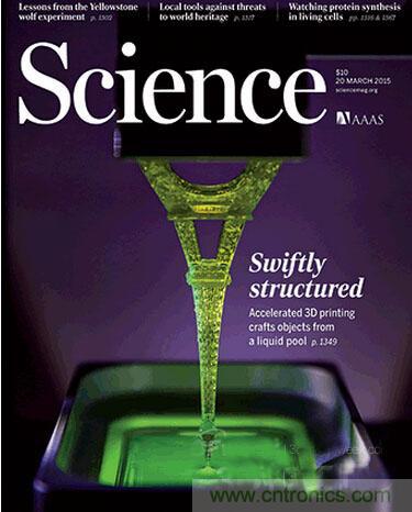 這些神奇的動圖都出自最近發(fā)表在《科學(xué)》(Science)上的一篇有關(guān)3D打印技術(shù)的研究論文。這種新技術(shù)顯然也征服了期刊的編輯,在期刊封面上都出現(xiàn)了這個(gè)從液體中打印出來的“倒立鐵塔”的身影。那么,這種液體3D打印技術(shù)究竟有什么過人之處?球和塔又是怎么從液體里“拉”出來的呢?