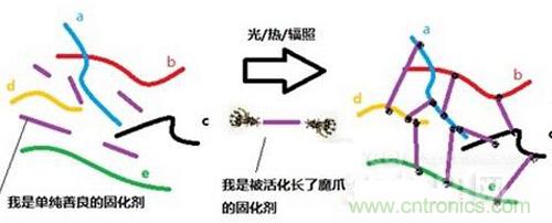 把相對容易流動的液體材料變成固體,這種思路其實(shí)并不新鮮,硫化橡膠就是這種材料加工方式的典型例子。那么,固化的過程是如何發(fā)生的呢?下面,就讓我們來看圖說話: