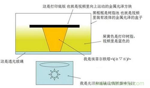 簡單來說,立體光固化的過程就是光照射光敏樹脂表面,使其固化成薄薄的一層固體,已經(jīng)固化完成的部分被一塊基板黏附著,逐漸與光照射面拉開一定距離(通常是每次移動十幾個(gè)微米),然后在上一層固化樹脂的基礎(chǔ)上再進(jìn)行下一層的照射和固化。經(jīng)過層層固化疊加之后,最終就形成一個(gè)完整的立體結(jié)構(gòu)。下面這張圖表示的就是SLA設(shè)備的基本結(jié)構(gòu),固化反應(yīng)發(fā)生在打印樹脂與透光玻璃板的交界面上,由于光照射面在液面的下方,打印的過程看上去就像從液體里“拉”出了打印制件一樣。