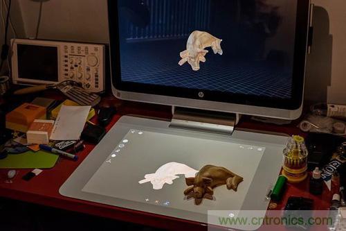 屏幕支架上方的是包含掃描儀相機(jī)的投影儀,允許在 Touch Mat 上盡可能直觀的使用。盡管 Touch Mit 本身并非觸控屏幕,但通過這些設(shè)備的交互能夠投影圖片并進(jìn)行相應(yīng)的觸控交互。Sprout Pro 正面裝備了支持 3D 眼鏡的 23.6 英寸 Zvr顯示器,同時支持虛擬現(xiàn)實(shí)和增強(qiáng)現(xiàn)實(shí)。