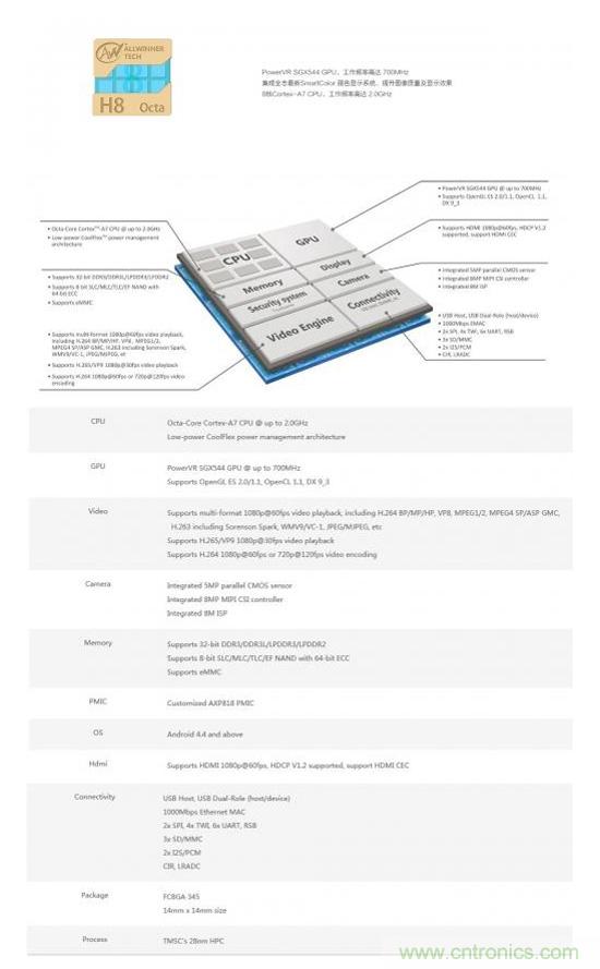 多媒體方面, H8支持多格式1080p@60fps視頻編解碼, 支持H.265/HEVC視頻處理,集成8M ISP圖像信號處理架構(gòu),可支持800萬像素攝像頭。 顯示方面,H8支持HDMI 1080p@60fps顯示,支持HDCP V1.2協(xié)議,支持HDMI CEC。此外,H8集成了全志新一代麗色顯示技術(shù),圖像顯示質(zhì)量進一步提升。事實上,H8芯片最早是應(yīng)用于電視盒子。